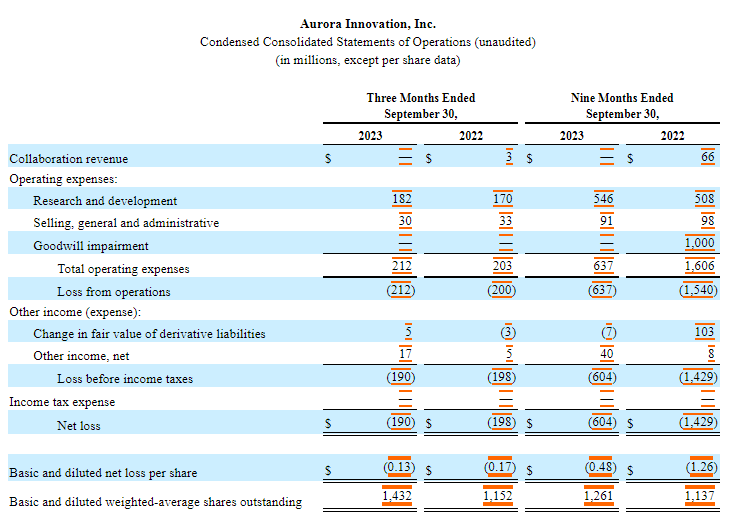 支出方面,Aurora第三季度支出2.12億美元,其中研發支出1.82億美元,占總支出的85.85%。綜合報表數據,公司今年第三季度凈虧損1.9億美元,與去年同期相差不大。