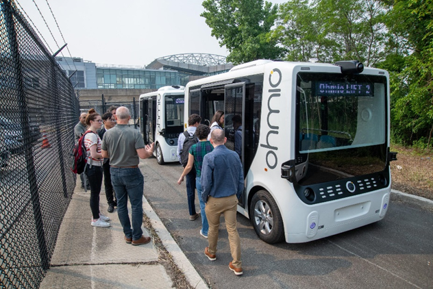 今年6月初,紐約新澤西州港務局創新中心和新西蘭自動駕駛交通公司Ohmio在肯尼迪機場舉行了首次由3輛無人駕駛擺渡車隊進行的自動駕駛演示。測試應用的每輛無人駕駛擺渡車可搭乘8名旅客。