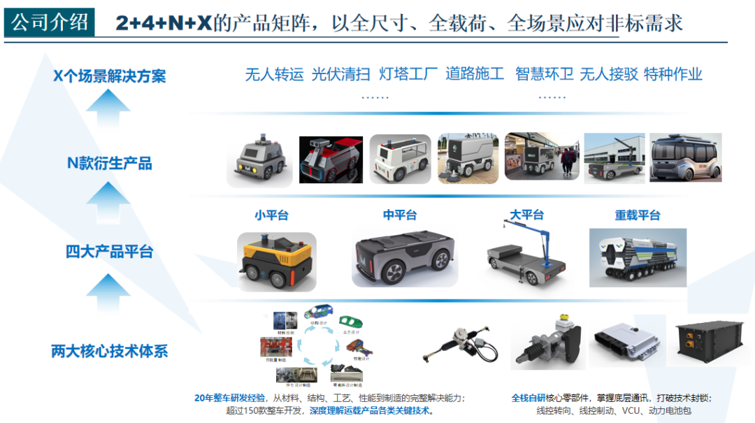 MARS事業部目前共有150人,其中博士3人,碩士10余人。專注于無人線控底盤和關鍵零部件的研發,涉及線控零件、底盤、控制等多個領域,具備從底盤、結構、到控制器的研發與設計能力。目前產品已覆蓋大中小、重載全尺寸,廣泛用于工業場景智能底座、無人售賣、無人物流、無人環衛、無人配送、智慧機場等場景。