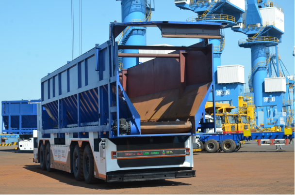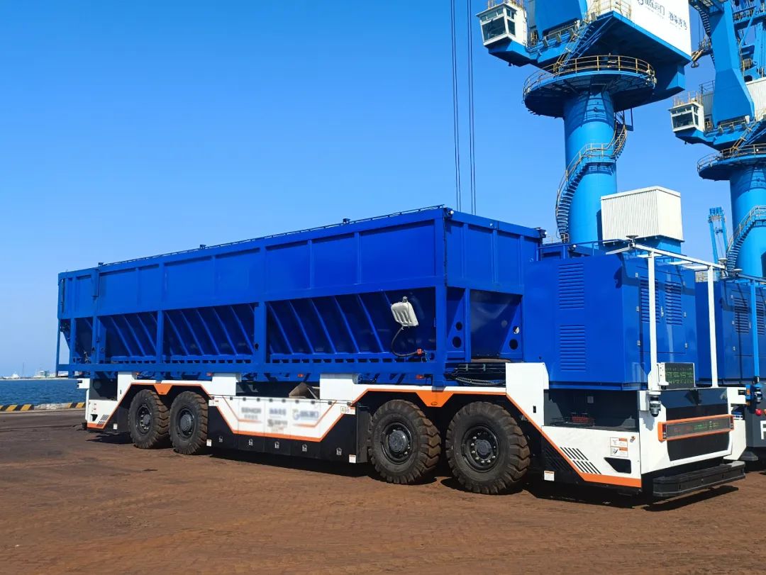 伴隨勞動力成本的不斷攀升,港口業務量的持續增長,港口運營方的安全、效率、成本等精細管控挑戰不斷加大。針對干散貨碼頭80%以上作業貨類為鋁礬土、砂石料等干散貨,物料散雜、設備交互配合頻繁,作業需求難度大且環境惡劣,作業人員需求龐大等發展痛點,國唐汽車打造“自動化門機+遠控智能清艙+無人駕駛電動自卸車”全流程設備自動化作業模式,創新打造的無人駕駛干散貨運輸車,相比一般的平板運輸車,上裝搭載了專用貨運箱,更便于干散貨的無人運輸。