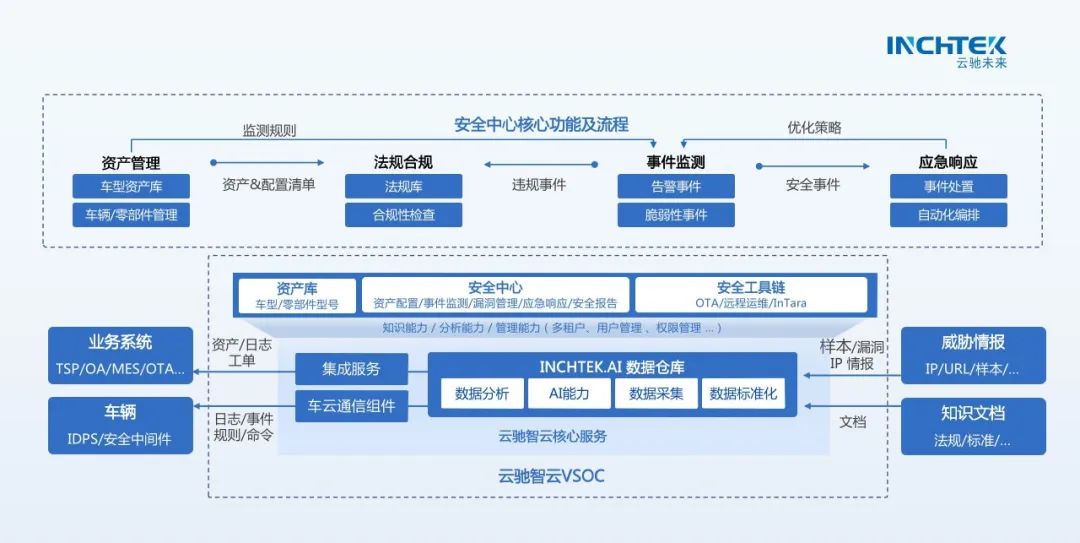 云馳智云安全運營中心VSOC通過為智能網聯汽車提供采集、分析、預警、處置的運營框架,幫助客戶持續應對網絡攻擊、威脅事件及漏洞。產品以合規為基礎能力,提供開箱即用的監測規則及報表報告,幫助客戶快速滿足法規要求,支撐國內外審核認證工作開展。在此基礎上,通過與InchTek安全工具鏈無縫銜接,賦能企業的威脅分析、需求管理、漏洞管理、應急處置,幫助車企守住安全底線,持續挖掘運營價值。