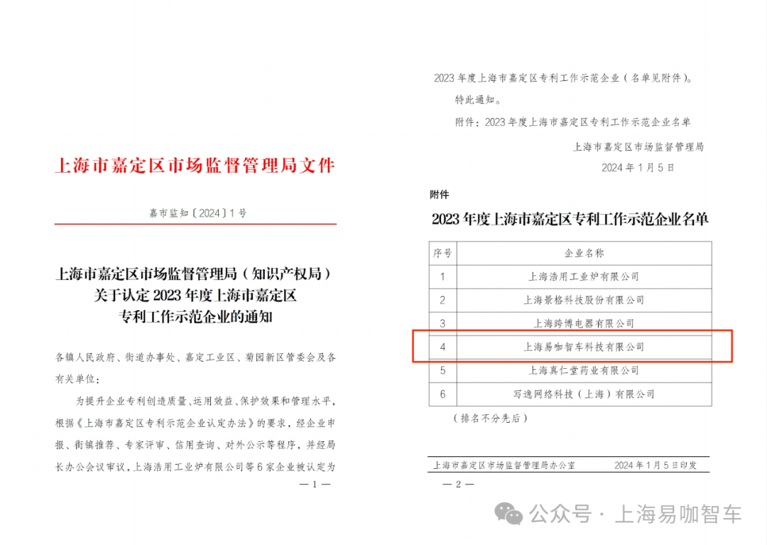 日前,上海市嘉定區市場監督管理局(知識產權局)公布了2023年度上海市嘉定區專利工作示范企業名單,共6 家企業被認定為2023 年度上海市嘉定區專利工作示范企業。易咖智車憑借優異成績入選,科技創新平臺再上新臺階。