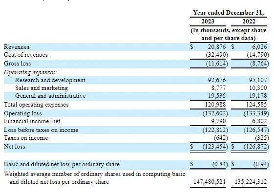 綜合來看,2023 年 Innoviz 整體凈虧損超 1.23 億美元,同比 2022 年虧損減少 341.8 萬美元;平均每股凈虧損 0.84 美元。