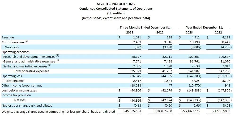 Aeva 2023 Q4 及全年未經審計的簡明綜合運營報表(來源:美國證券交易委員會,單位以千計,份額和每股數據除外)