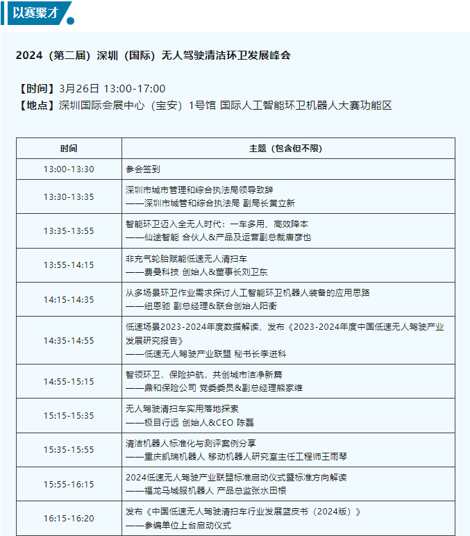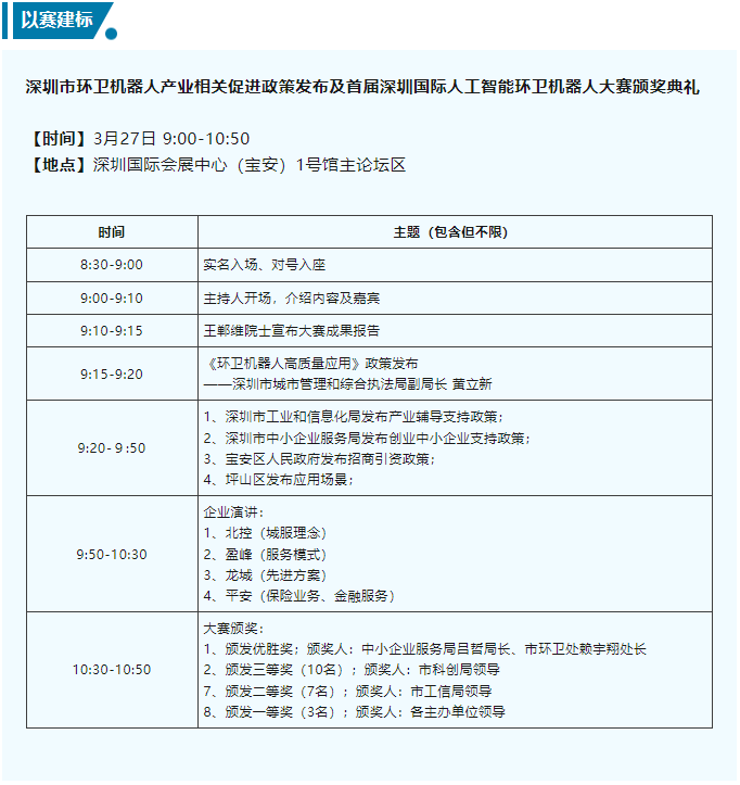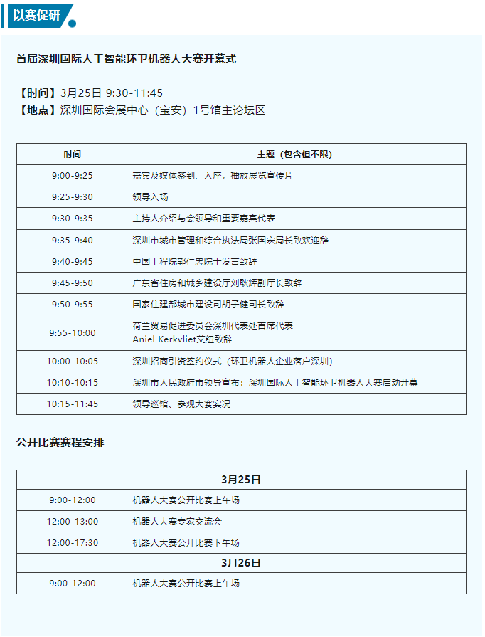 本次賽事將于3月25日-26日在深圳國際會展中心(寶安)-1號館舉行,旨在貫徹落實深圳市進一步推動“20+8”產業集群建設布局規劃,加快人工智能在環衛行業全時全域全場景應用,通過率先在深圳打造國家新一代人工智能創新發展試驗區和國家人工智能創新應用先導區,助力全國環衛行業人工智能的高質量發展高水平應用。