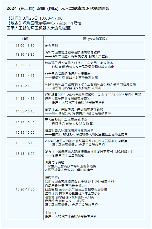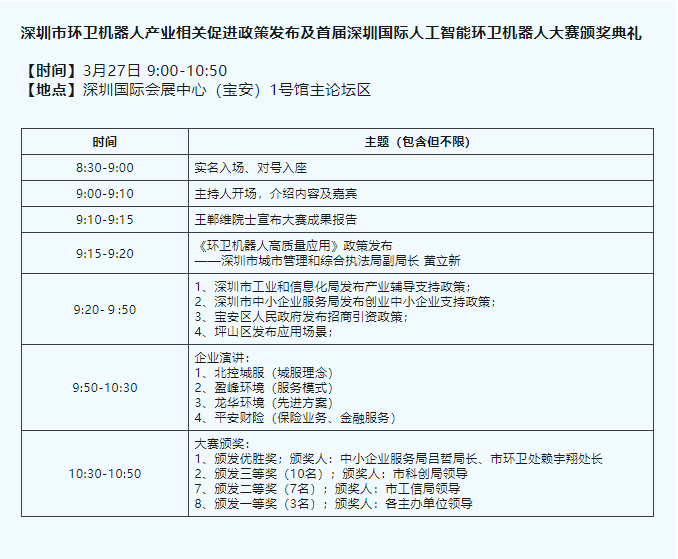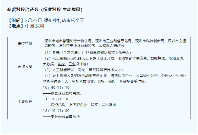 發布一套支持人工智能環衛機器人發展政策,在3月27日即將舉行的商務對接洽談會上,由深圳市城市管理和綜合執法局、深圳市工業和信息化局、深圳市科技創新局、深圳市交通運輸局、深圳市中小企業服務局、寶安區人民政府主持,政資企用多方面對面深入洽談,精準對接。多場高質量配套活動,敬請期待!