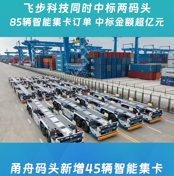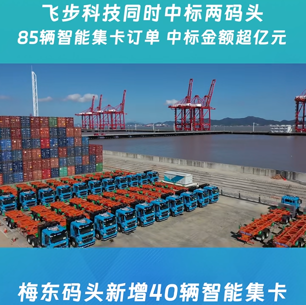 近日,人工智能企業飛步科技宣布,公司已分別中標“寧波梅東集裝箱碼頭有限公司40輛智能集卡采購項目”與“舟山甬舟集裝箱碼頭有限公司45輛智能集卡采購項目”,中標智能集卡總數達85輛,中標金額超億元人民幣。