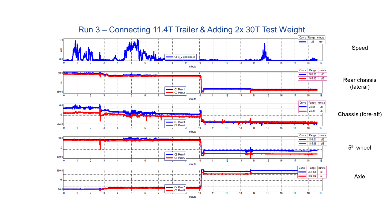 通過港口實際連接及脫離掛車,加速減速,轉彎,緊急制動工況的路譜采集,應力應變采集完成實測。