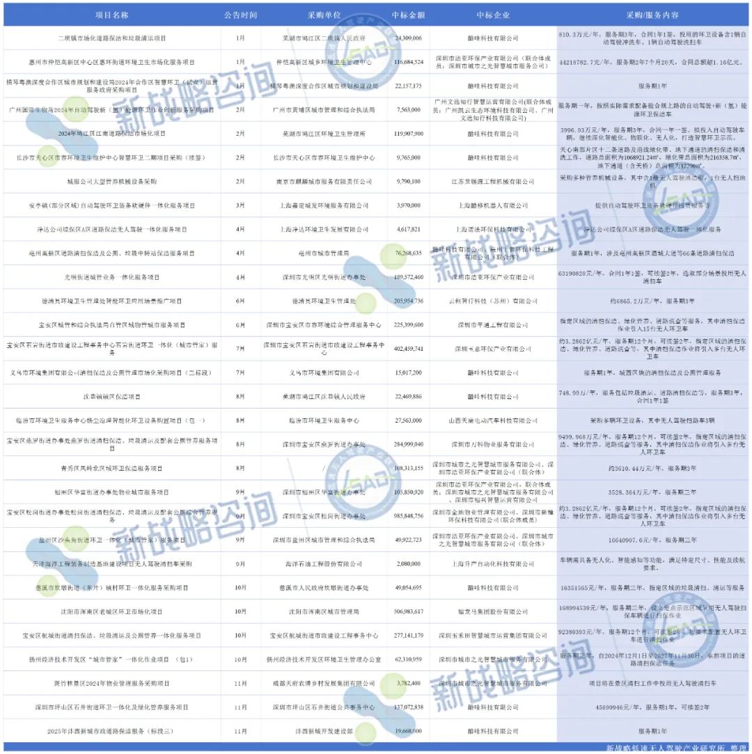 可以明顯看出,今年的增長主要來自市政環衛服務項目。其中項目總金額達億元級的就有12項,最高的是深圳市寶安區“松崗街道清掃保潔、垃圾清運及配套公廁綜合管養服務項目”,中標金額為3.2862億元/年,在清掃保潔作業中已確定將投用10余臺無人清掃車。