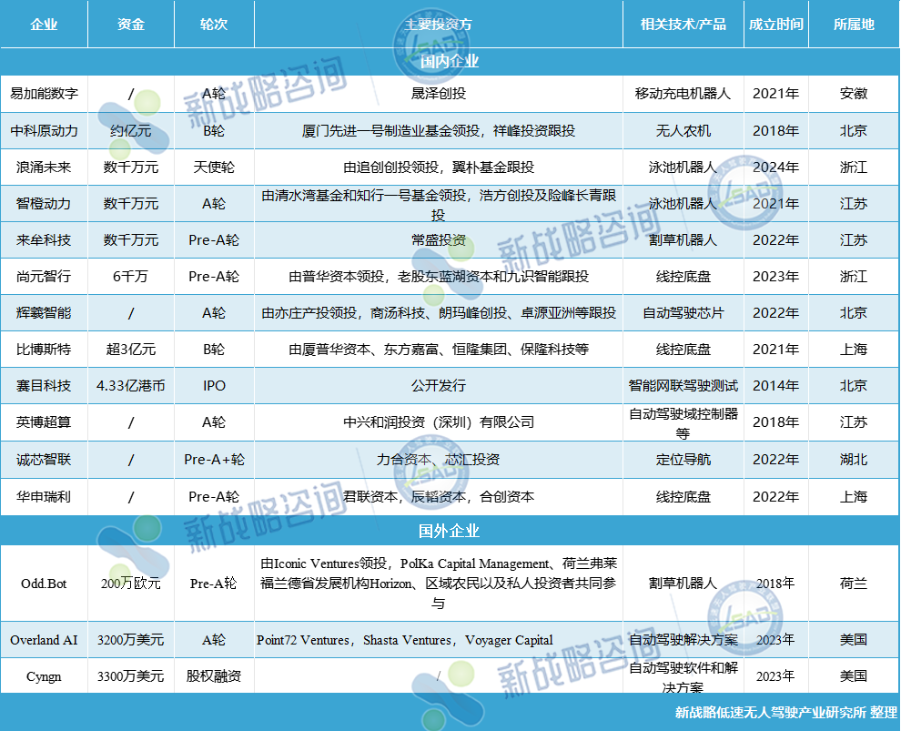 獲得融資的整車 / 自動駕駛解決方案企業,多為庭院服務機器人企業。其中,來自泳池機器人賽道的浪涌未來和智橙動力,兩筆融資皆源于產業資本,前者追創創投是掃地機器人龍頭追覓科技旗下基金,后者基金主要來自科沃斯。