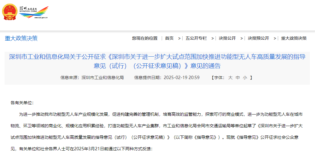 2月19日消息,為進一步推動深圳市功能型無人車產業規?;l展,《深圳市關于進一步擴大試點范圍加快推進功能型無人車高質量發展的指導意見(試行)(公開征求意見稿)》公開征求意見。其中提到,統籌推進,試點先行。發揮市級層面統籌協調作用,整體推進功能型無人車運營試點管理工作。