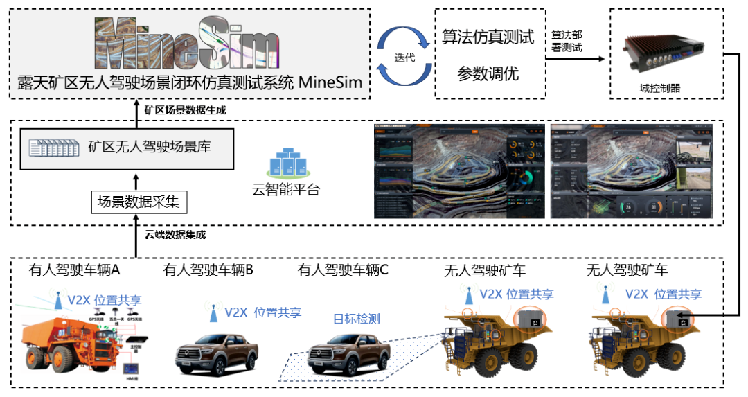 “MineSim”是專為露天礦區無人駕駛運輸場景設計的仿真系統。它基于大量真實礦區場景數據,構建了動靜態障礙物場景庫,涵蓋重型礦用卡車執行機構響應滯后、不規則道路邊界、異形交叉路口等復雜非結構化特征。