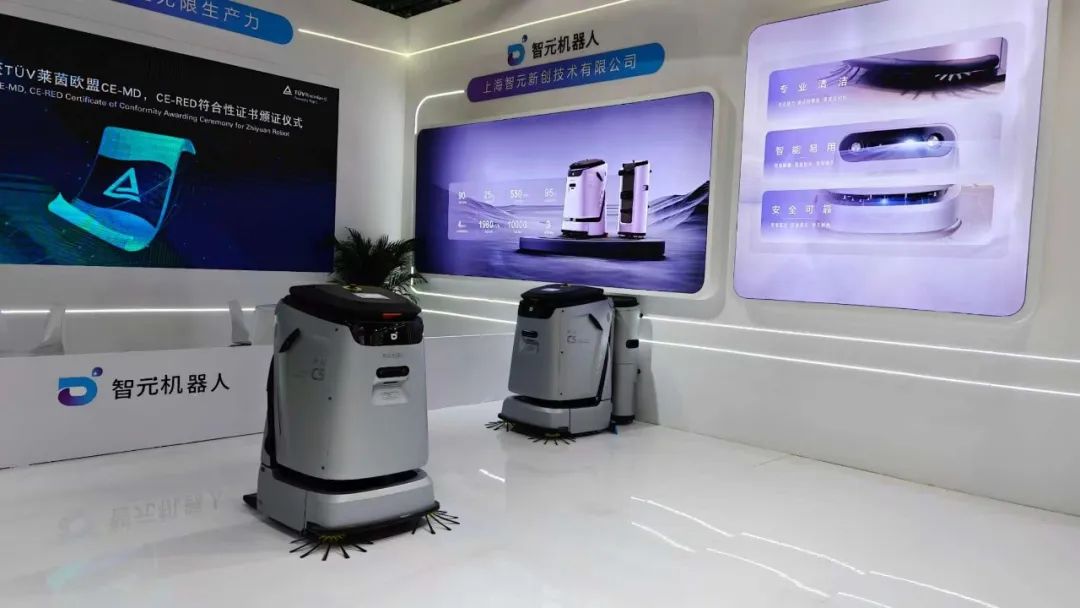 智元機器人重點展出了絕塵系列清潔機器人C5、V5,其中,C5是智元機器人在2024年推出的首款面向中大型場景的智能清潔機器人設備,具備掃地、洗地、塵推等多種清潔功能,滿足各類硬質地面清潔所需。