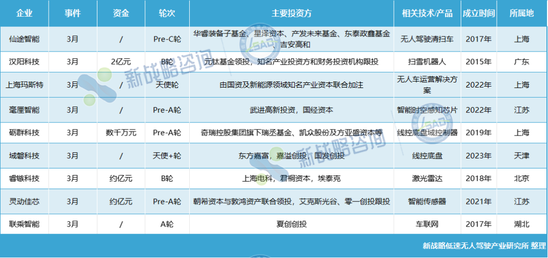 從融資領域來看,3月獲得融資的企業,大部分是供應鏈企業,包括智能時空感知芯片研發商毫厘智能、靈動佳芯、聯乘智能等。僅有仙途智能、漢陽科技、上?,斔固厥钦?自動駕駛解決方案企業。且能注意到,隨著各類無人車應用規模逐步擴大,無人車運營相關企業也在資本助力下加速發展。