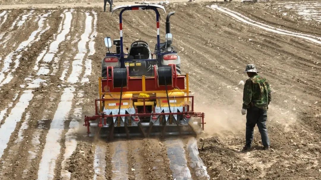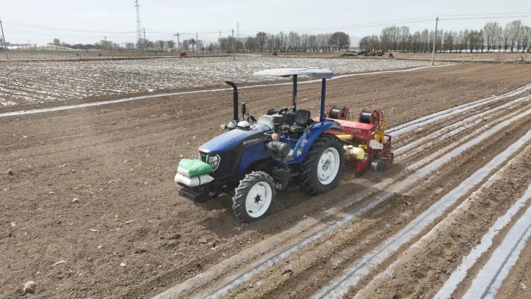 在技術人員設定參數后,搭載北斗導航系統的播種機自動規劃路線,靈活地轉彎、掉頭,所到之處,土地被整齊地翻耕,地膜被平整鋪展。機身配備的智能傳感器實時監測土壤濕度、種子間距等關鍵數據。