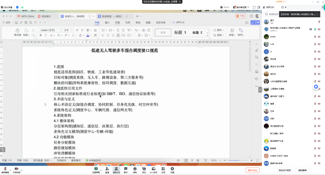 5月9日上午,低速無人駕駛產業聯盟標準化技術委員會組織召開“2025年團體標準草案第一次線上討論會”。聯盟專委會代表以及標準參與單位有關負責人參加會議。