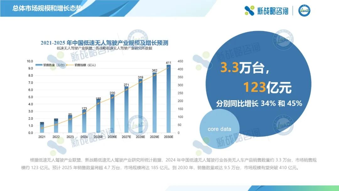 《2024-2025年中國低速無人駕駛產業發展研究報告》指出,根據低速無人駕駛產業聯盟數據,新戰略低速無人駕駛產業研究所統計,2024年中國低速無人駕駛行業銷售規模已達123億元,同比增長45%。主要場景應用的各類無人駕駛車輛銷售數量約3.3萬臺,同比增長34%。