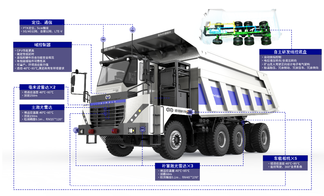 整車部分,銥鉬無人駕駛寬體礦卡使用全自研線控底盤,專為各類露天礦區環境設計,深度融合無人駕駛技術、先進傳感器技術與可靠通信技術,應用于216~300噸位車型上,其中EM216H額定載重150噸,為國內同類車型載重最大車型,后續的260噸的無人駕駛車型正在研發中。