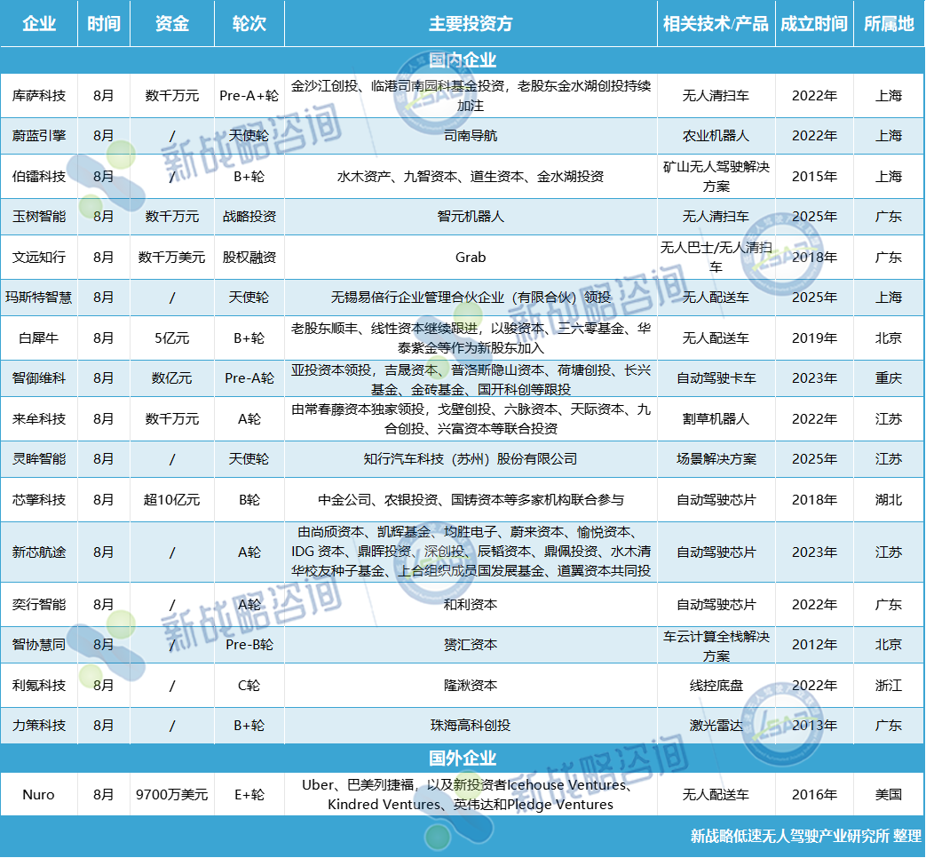 2025年8月自動駕駛領域融資情況(根據公開信息整理,未完善之處請指正?。?/span>