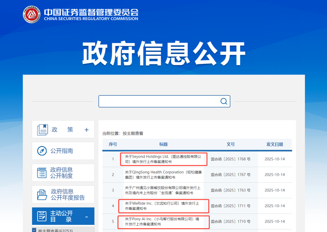 10月14日,中國證監會同步公布關于文遠知行、小馬智行、Seyond圖達通的境外發行上市備案通知書,三家企業的IPO目的地均為香港,這也意味著它們已掃清關鍵監管障礙,即將登陸香港聯合交易所。