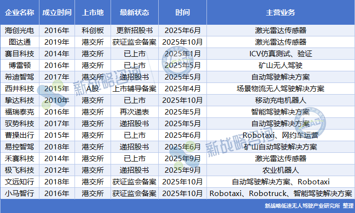 據新戰略低速無人駕駛產業研究所統計,2025年以來,國內自動駕駛領域有超過15家企業更新上市狀態(包括上市成功、遞表、獲證監會備案等),其中有13家企業上市目的地為港股,占比超86%。