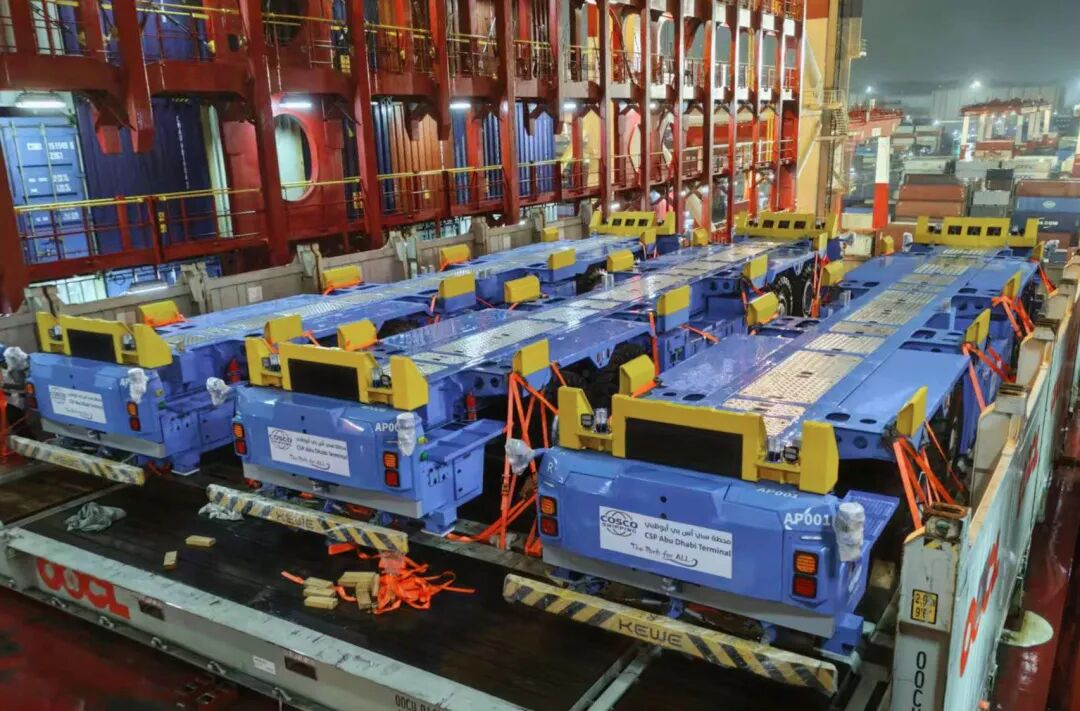 日前,中遠海運港口阿布扎比碼頭(CSP ADT)無人車隊擴編項目迎來關鍵節點——此次擴編將計劃引入共6臺Q-Chassis無人駕駛重載水平運輸車(又稱IGV) ,首批3臺已經從國內裝船啟運,預計10月底抵達阿布扎比。
