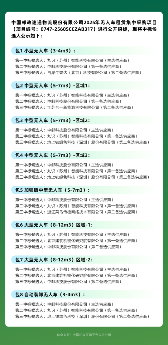 不止如此,在中國郵政近期公布的全球最大規模無人車租賃集采項目結果中,九識智能(Zelos)包攬該項目全部標段,并在第1、2、6、7四個標段中以絕對優勢確定為主供應商,成為中國郵政無人運力核心合作伙伴,實現全球頂尖科技力量與中國“國家隊”物流體系中的深入嵌入。