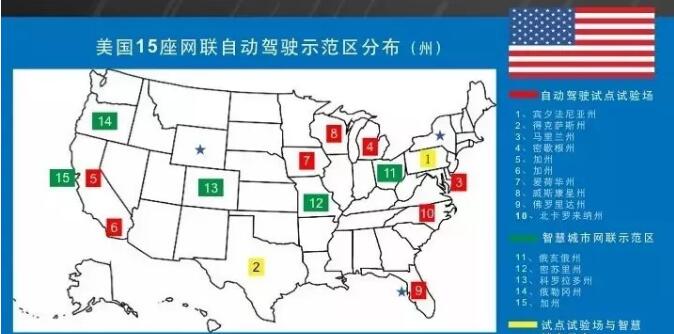 圖中紅色標示(以及黃色標示的2)是美國交通部指定的十大自動駕駛試驗場分布地,資料來源:VehicleTrend《美國15座網聯自動駕駛測試示范區評價排名》