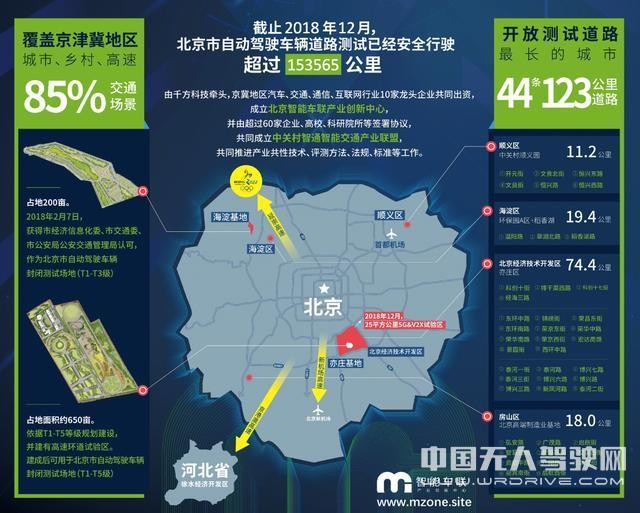 從2018年2月以來,北京市累計開放了4個區域的44條道路,共計123公里。覆蓋了極簡城市場景、簡單城市場景、常見城市場景、特殊城市場景、特殊環境場景等85%左右的城市交通場景和80%的鄉村道路場景環境,還可提供隧道、高速收費、服務區、鐵路道口、雨霧模擬、光照模擬等眾多測試情境。舉個例子,光是交叉口就包含了十字口、丁字口、環島口等各種類型。
